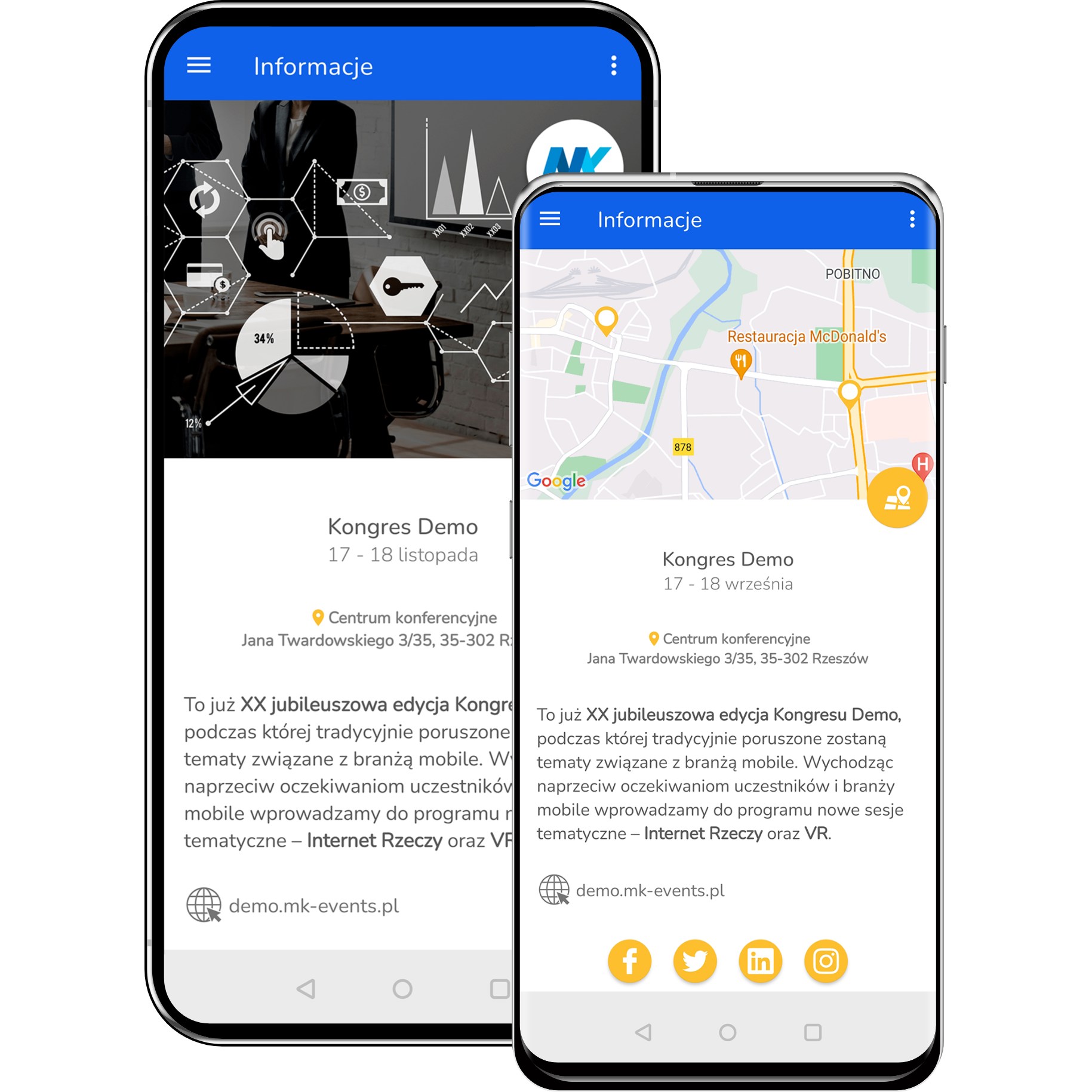 Dzięki mapie uczestnicy mogą w szybki i prosty sposób zlokalizować miejsce wydarzenia, jak również włączyć nawigowanie w zewnętrznej aplikacji. Zamiast widoku mapy, można zamieścić zdjęcie lub baner konferencji.