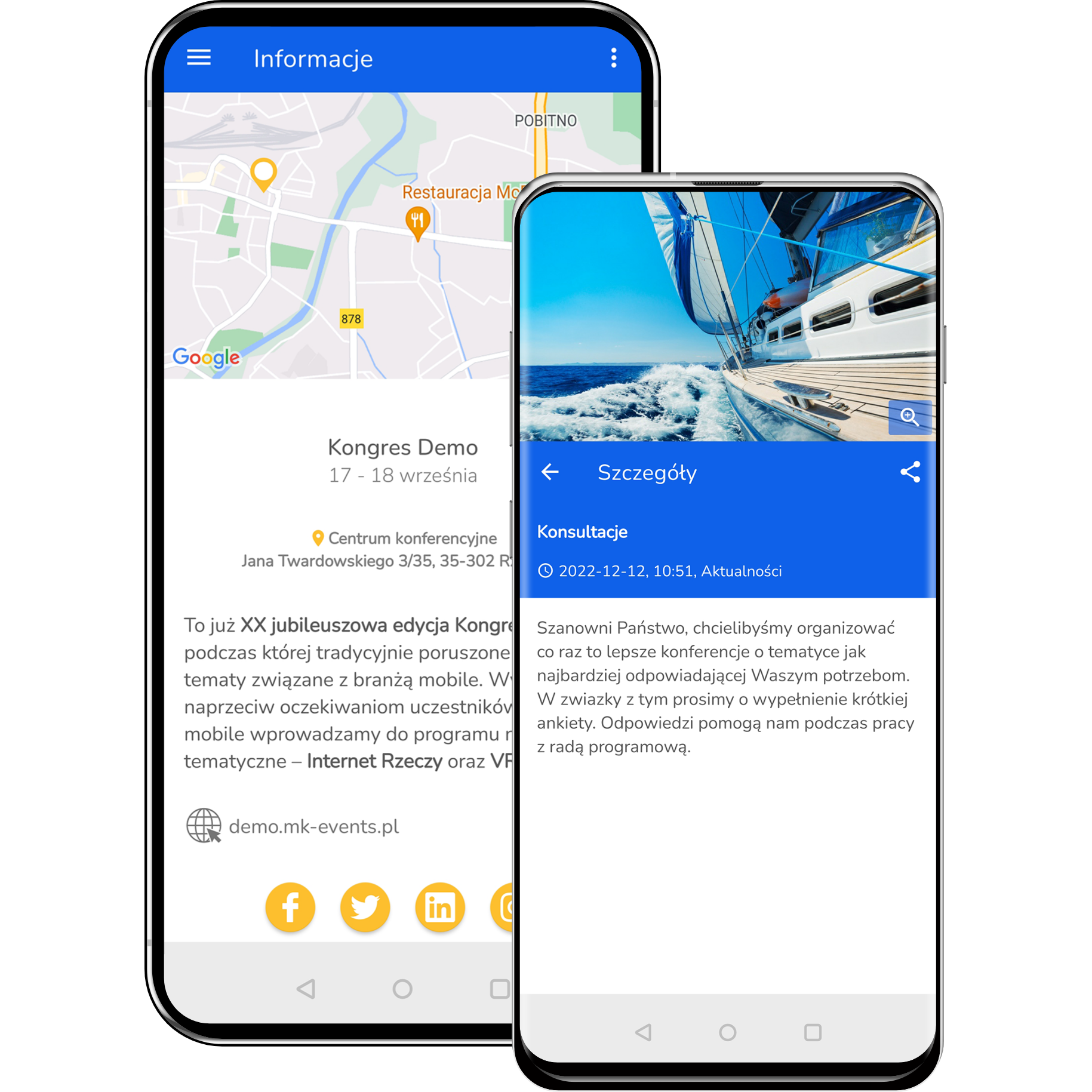 Współcześnie media społecznościowe są istotnym elementem w promocji wydarzenia. Dlatego też w aplikacji MKonferencja udostępniliśmy funkcje dzielenia się poszczególnymi informacjami w social mediach, np. informacją o konferencji, danej prelekcji, prelegencie, artykułem i zdjęciem.